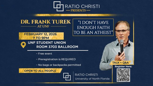 Ratio Christi is a wonderful ministry we support here at Reach. They're hosting an event on Thursday, February 12, at UNF from 7:00 - 9:00 p.m. Dr. Frank Turek will be their guest teacher and he is a well-known author and apologist. It will be a great time together but the event will fill up fast and registration is required. If you are interested in attending, sign up on the app or click HERE and reserve your seat today.